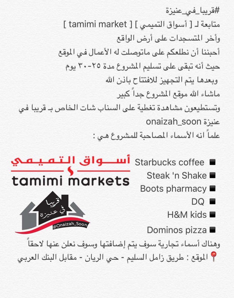 قريبا في عنيزة On Twitter قريبا في عنيزة متابعة لـ أسواق التميمي Tamimi Market وأخر المتسجدات على أرض الواقع أحبننا أن نطلعكم على ماتوصلت له الأعمال التفاصيل Https T Co Iy7omrpwuw